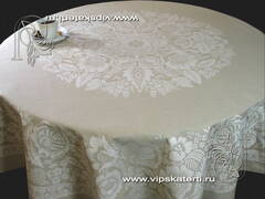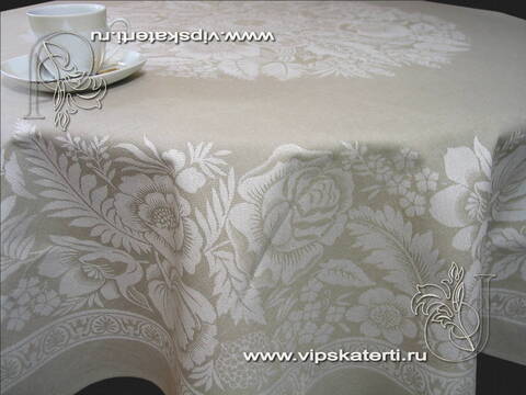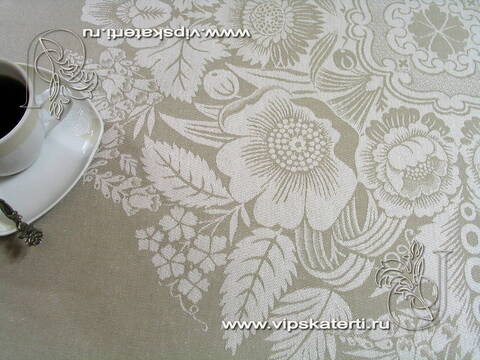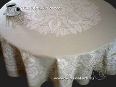 Цветы и листья, сплетаясь в пышном венке, образуют широкую нарядную кайму скатерти, а середина полотна украшена цветочным орнаментом в виде роскошного букета. Скатерти предлагаются в различных цветах.