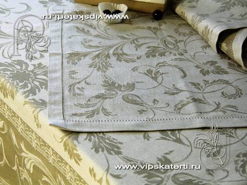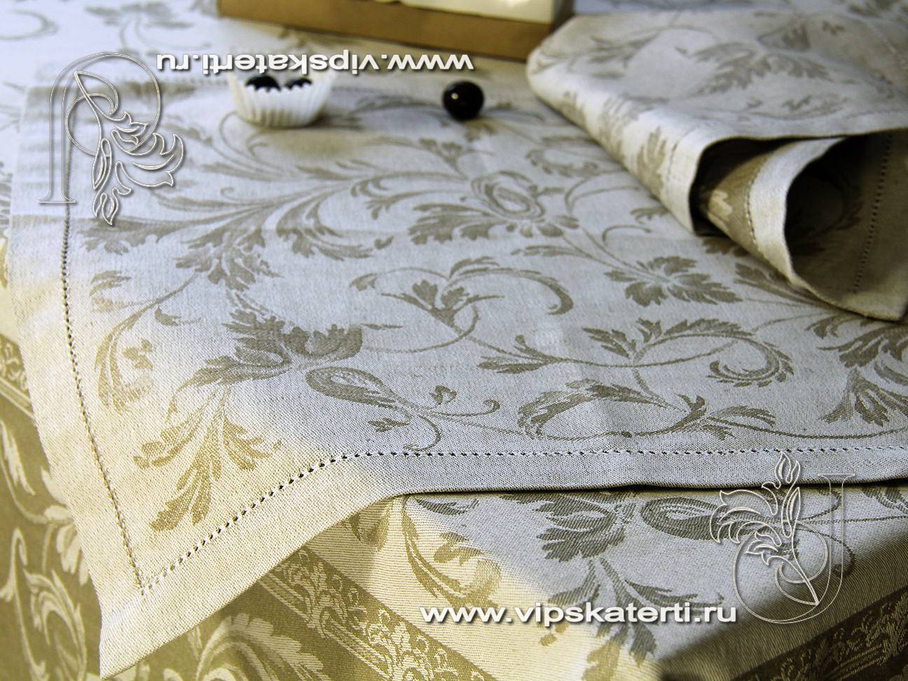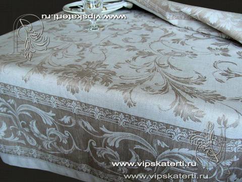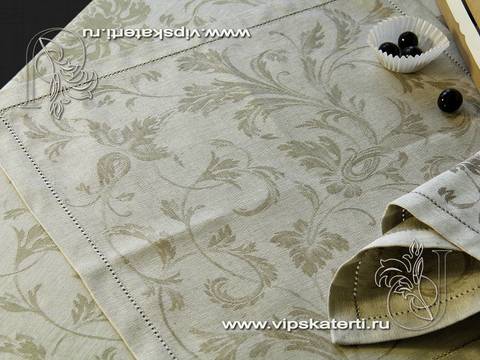 Основа комплекта - светло-бежевая скатерть с растительным орнаментом, равномерно заполняющим центральную часть изделия, окаймлена более темной полосой, украшенной регулярными мотивами из переплетающихся листьев. Такая скатерть заменит пять других, настолько она универсальна по цвету и декору. Для любого хорошего праздника, и на каждый день - эта модель поможет красиво сервировать стол. В комплекте льняные салфетки "Мелодия" размером 45х45см, отделанные мережкой.